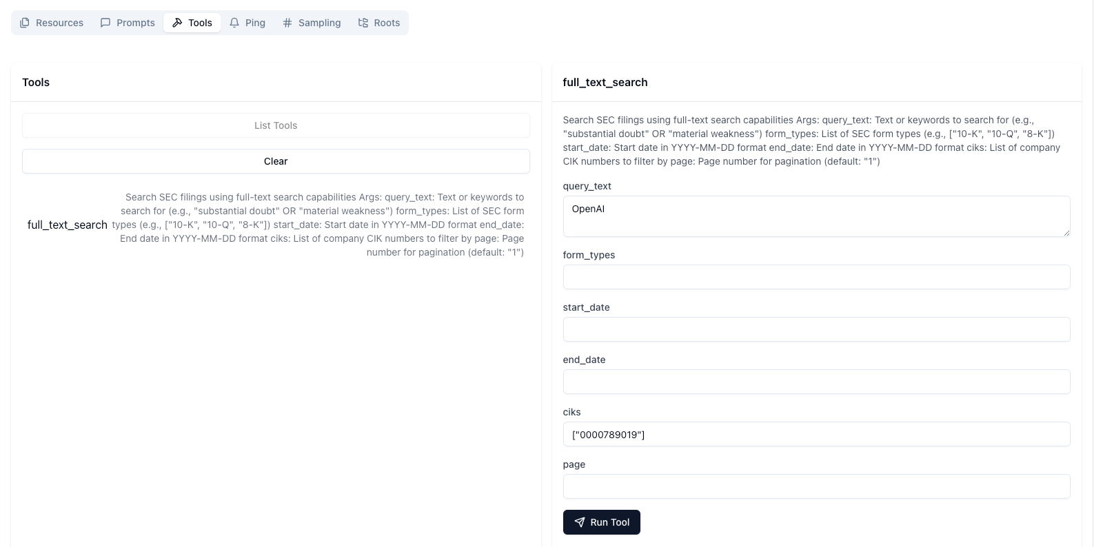 mcp dev server.pyBy default the MCP Inspector runs on the port 6274 and you can run the tools to check the output. One example query is run below for query "OpenAI" with the cik for Microsoft.